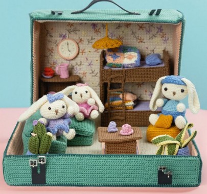 De speelwereld van de konijnenfamilie is zorgvuldig opgebouwd: een hoekbank met kussentjes, een krukje en tafeltje, en een paar planten in bloempotten. Voor het stapelbed haakte ik twee soorten dekentjes met dezelfde kleuren, maar verschillende motieven, inclusief hoofdkussens. Toen iemand opmerkte dat het stapelbed een trap moest hebben, heb ik die ook toegevoegd voor meer realisme.